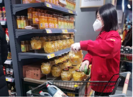 其中紫東店的調(diào)味區(qū)主管楊麗就是堅(jiān)守在崗位的一員。紫東店調(diào)味區(qū)員工都生病請假了,導(dǎo)致調(diào)味區(qū)沒有員工,這時調(diào)味主管楊麗堅(jiān)持帶病工作,她一個承擔(dān)了幾個人的工作量,上貨、做陳列、打掃衛(wèi)生、服務(wù)顧客,補(bǔ)貨,工作一點(diǎn)也沒有耽誤。